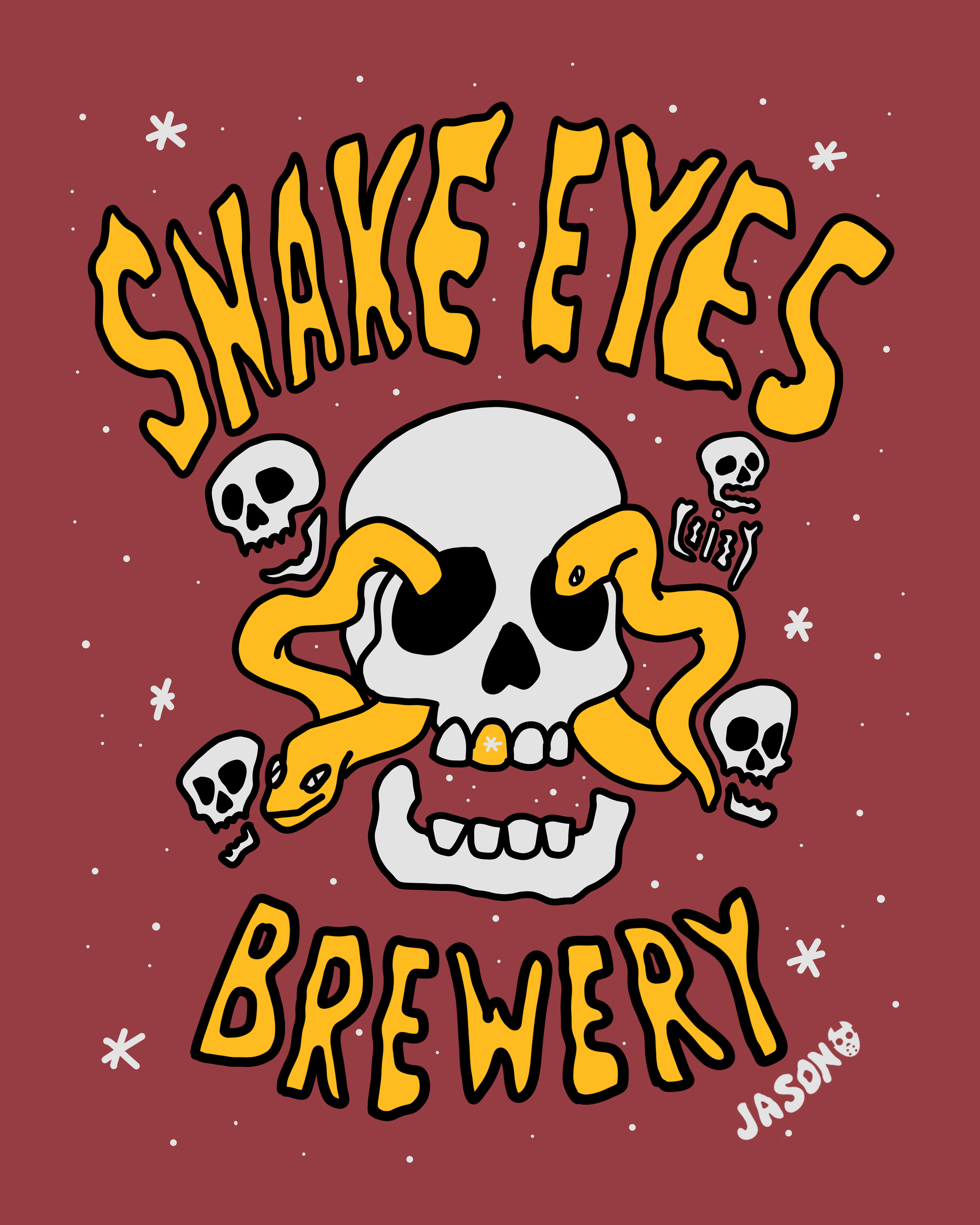 Snake Eyes Brewery: A Brew with a Bite In this design, I unleashed a dose of edgy fun for Snake Eyes Brewery with this custom illustration. Combining a classic skull motif with slithering surprises, this design embodies the brewery's grungy spirit. The central skull icon, rendered with a bold, hand-drawn feel, forms the centerpiece. Glowing snake eyes and winding serpents add a touch of the unexpected, while smaller skull icons and playful star accents enhance the composition. The brewery name is integrated seamlessly, creating a balanced and eye-catching design. The design draws inspiration from classic tattoo art, motorcycle culture, and the raw energy of punk music, reflecting the brewery's rebellious spirit. From initial sketches to the final digital rendering, this project showcases the journey of bringing the concept to life. The design is bold, memorable, and ready to be emblazoned on merchandise, signage, and more. Check out the full project to see the detail behind the design! #illustration #beerbranding #skullart #brewerydesign